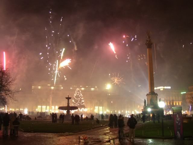 Fomos ver a queima de fogos na praca principal do centro da cidade, o conhecido e lindo “Schlossplatz (Lugar do Castelo)”. Chegamos 40 minutos antes da virada, mas tivemos a sensacao de que nossos relogios estavam atrasados, uma vez que muitos fogos já estavam sendo queimados e, um pouco antes da meia-noite, nos sentimos numa verdadeira sauna com aroma de pólvora! E pior, para nossa surpresa, percebemos que aquela queima nao era organizada pela prefeitura (como Berlim, por ex.), ao contrário, todos os fogos ali queimados sao de pessoas comuns que os compram e vao para lá na virada queimá-los como forma de diversao.