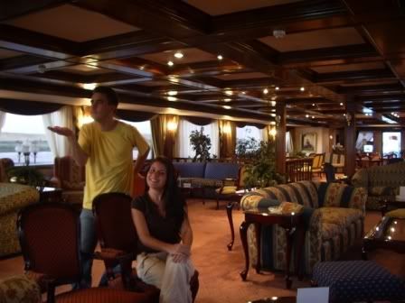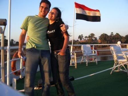 Navio dos sonhos… entediados! Gracas a Deus que o navio sempre parava pra gente fazer um passeio, caso contrário eu ia acabar pulando no rio (e morrendo intoxicada)! Quem me conhece sabe que sou hiper-super-mega-ativa e que odeio ficar em lugares com espaco limitado por muito tempo e um passeio de navio traz este incoveniente. Pra piorar era cheio de fluflu (entenda: coisas superfulas e engordantes). Tinha o lado bom: a comida e os garcons (e o Rô sempre!!!)! A comida era variada (e seguramente limpa) e os garcons fantásticos (e grudentos). Eu e o Rô eramos os queridinhos, talvez porque eramos os únicos jovens e nao-europeus do navio nos primeiros dias! Eles ficavam o tempo todo fazendo gracinha pra gente e eu me matava de rir com aquela situaçao. Tinha um que falava muito pouco ingles, entao olhava pra gente e sempre falava com entonacao de pergunta: “Futebol? Futebol?” e comecava a chutar o ar. Uma comédia! Nosso navio poderia se chamar: “Asilo Germânico Fluvial” sem a menor margem de erro! Chegando nele percebemos que seria uma longa semana a ser dividida apenas com idosos (acima dos 60) e, pior, alemaes! Sim, porque tem um monte de velhinha gente fina no Brasil, com as quais eu amaria dividir um navio, mas alemaes… só por Alá mesmo! Quando podiamos nos imaginar dividindo um cruzeiro no Nilo com um dos povos mais preconceituosos com estrangeiros como os alemaes. E pior, ter que participar de discussoes sobre os problemas que a alemanha enfrenta por causa desses invasores. No minimo interessante, nao!?