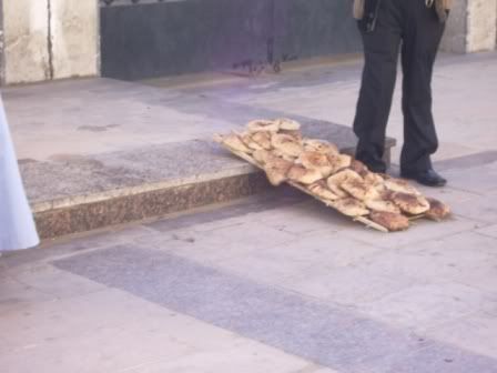 Uma das provas da falta de higiene sao os paes que eles comem o dia inteiro. Estes sao estendidos sobre tábuas nas ruas e ficam lá, o dia inteiro acumulando poeira, bichos passando, maos imundas tocando, mas mesmo assim, sao cobicados e vemos vendedores os carregando pra lá e pra cá o tempo todo na mao… isso mesmo… na mao! Afff… A fome teria que apertar muito pra eu encarar…