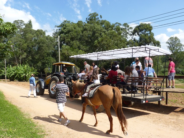O visitante pode passear a cavalo ou, se preferir, pode pegar carona no “trenzinho” que é puxado por um trator. Sensacional a idéia! Mas confesso que eu preferia dar uma volta de trator. Já andei na garupa de um, mas juro que queria dirigir. Quem sabe não negocio com o moço da próxima vez. Tá, fiquem tranquilos que aviso qual será o dia, pra vocês tomarem cuidado se estiverem por lá. 😀